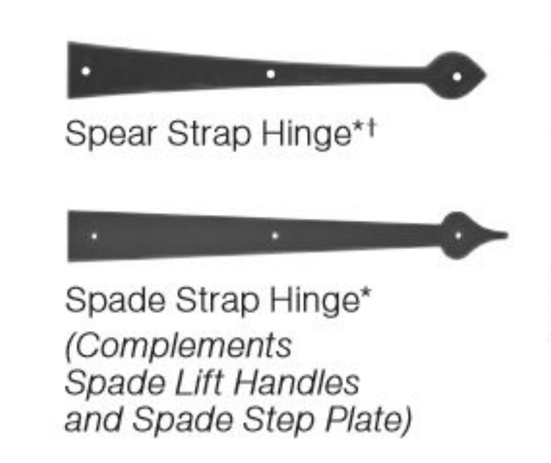 Hinges Single car under 12’ wide, single-end 11 gauge graduated galvanized. Double car 12’ wide and over, double-end 11 gauge graduated galvanized.